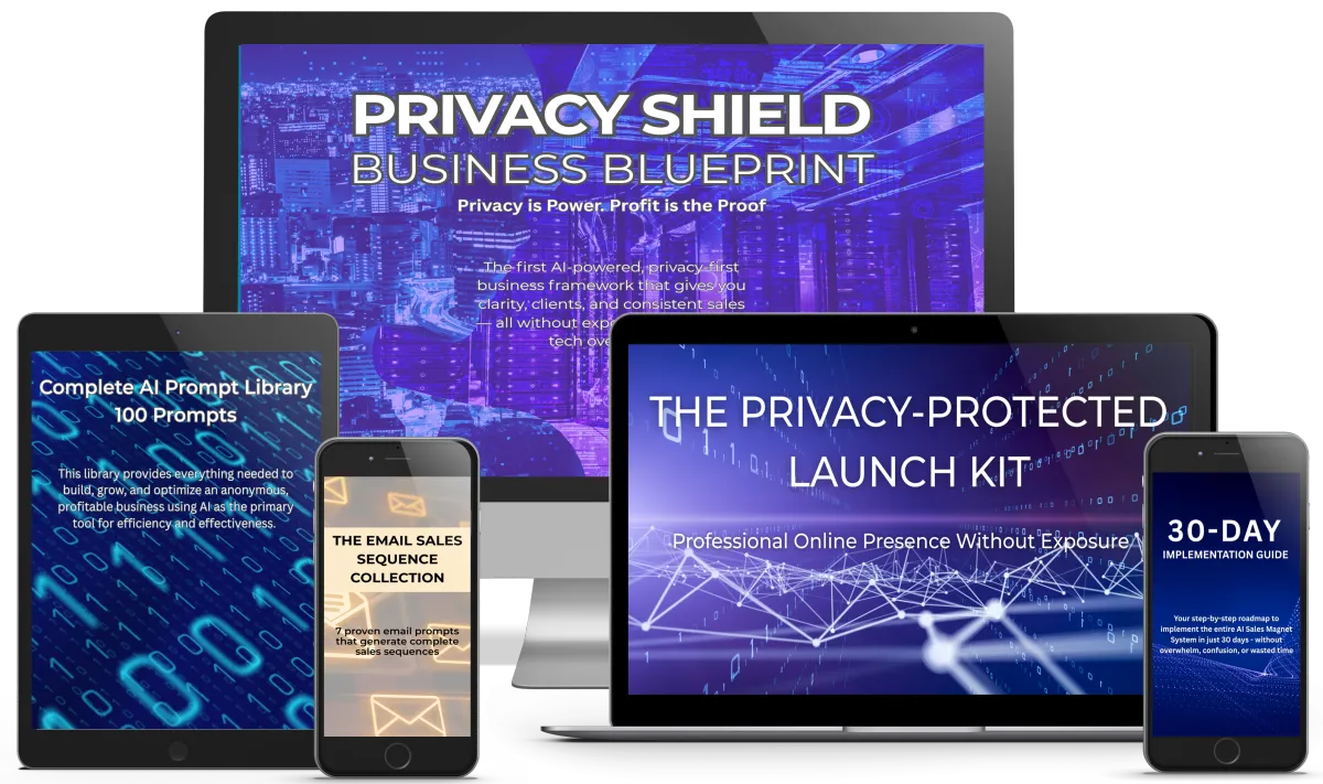 Privacy Shield Business Blueprint — 10 comprehensive modules (6 core + 4 advanced bonus modules) with step-by-step framework for launching your private, AI-powered business